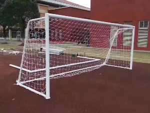 5人制球門標準:球門設在兩條球門線的中央。由兩根內側相距3米的直立門柱與一根下沿地面2米的水平橫梁連接而成。門柱與橫梁的寬度均為8厘米。球門后掛有網,網與門柱、橫梁應有一定空間、以不影響守門員活動和便于觀察球進門為原則。球門可以固定,亦可以搬動。