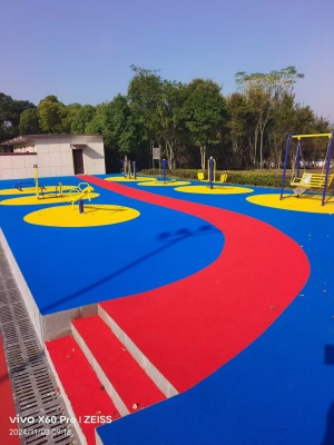 3、底層攤鋪:用橡膠顆粒和專用膠水按8:1重量配比(選的顆粒不同,膠水配比也不同),用攪拌器械在攪拌區攪拌均勻,用送料車送到預先劃好界線處,用刮尺攤鋪,用滾碾子壓實。待底層固化后開始面層攤鋪。經過二至三小時的固化,再次用滾碾子壓實,不平整的地方用鏝刀拍打平整,如鏝刀、滾碾子粘顆粒,沾少許稀釋劑起到光滑的作用。